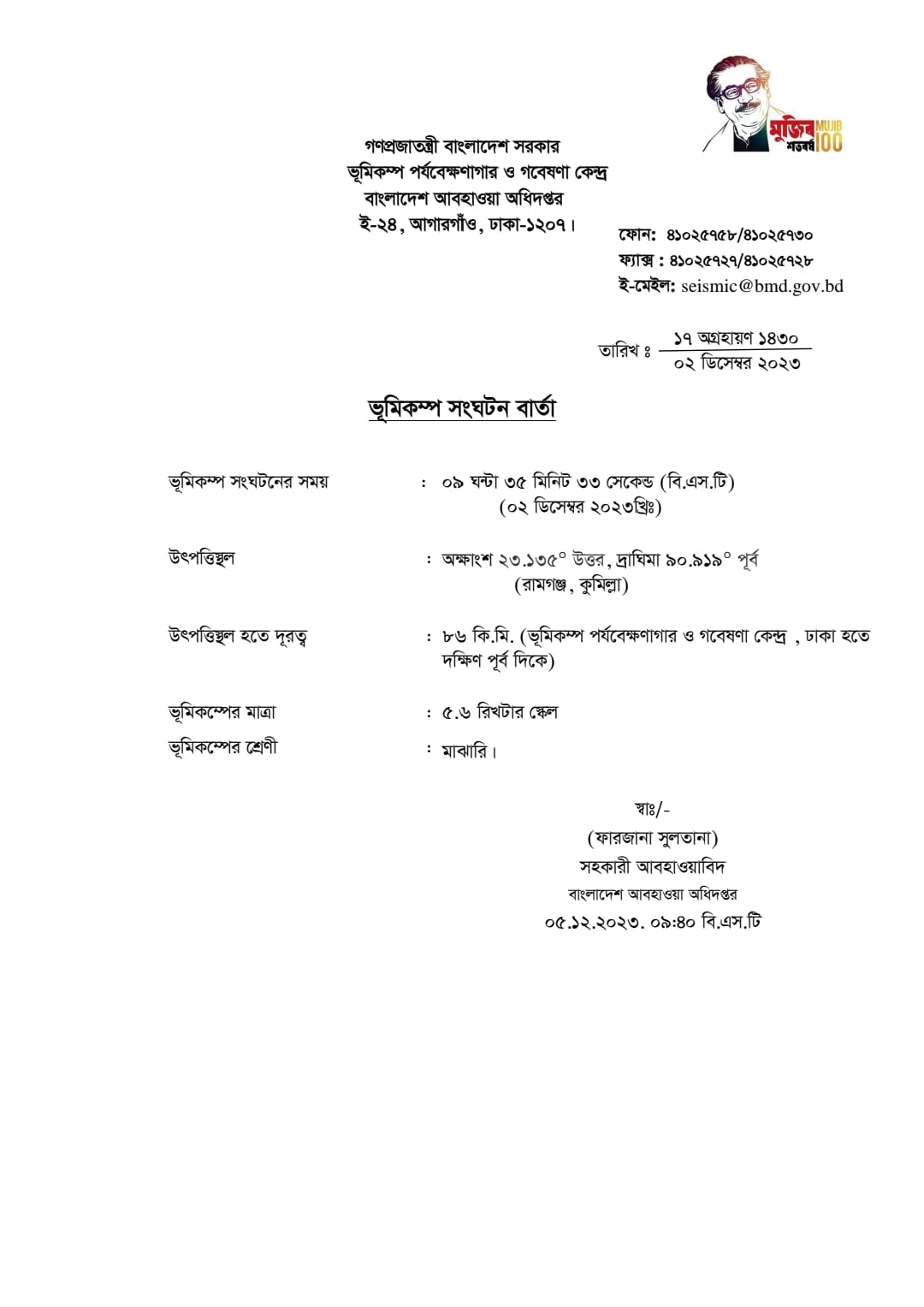 কুমিল্লা অঞ্চলের রামগঞ্জের উৎপত্তিস্থল থেকে নোয়াখালী সহ সারা দেশে ৫.৬ মাত্রার ভূমিকম্প অনুভূত। শনিবার ২ ডিসেম্বর সকাল ৯ টা ৩৫ মিনিট ৩৩ সেকেন্ডে ঢাকা থেকে ৮৬ কিলোমিটার দূরে কুমিল্লা অঞ্চলের রামগঞ্জে এই ভূমিকম্পের উৎপত্তি হয়।
